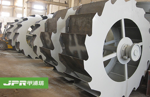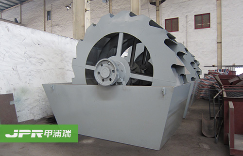 工作時(shí),電機(jī)通過(guò)三角帶、減速機(jī)、齒輪減速后帶動(dòng)葉輪緩慢轉(zhuǎn)動(dòng),砂石有給料槽進(jìn)入洗槽中,在葉輪的帶動(dòng)下翻滾,并互相研磨,除去覆蓋砂石表面的雜質(zhì), 同時(shí)破壞包覆砂粒的水汽層,以利于脫水;同時(shí)加水,形成強(qiáng)大水流,及時(shí)將雜質(zhì)及比重小的異物帶走,并從溢出口洗槽排出,完成清洗作用。干凈的砂石由葉片帶 走,后砂石從旋轉(zhuǎn)的葉輪倒入出料槽,完成砂石的清洗作用。